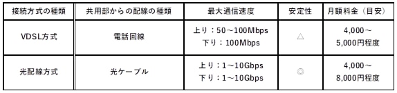 一方、VDSL方式は前述したように、最大通信速度は、上り50〜100Mbps・下り100Mbps程度で、光配線方式との速度の違いは明らかです。